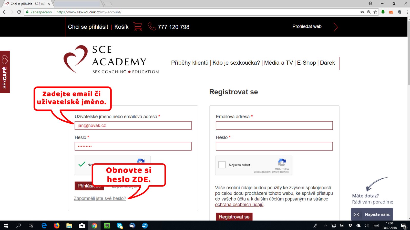 Do políčka s názvem „Uživatelské jméno nebo emailová adresa“ vyplňte svůj email, kterým jste se registrovali.  Pokud jste zapomněli heslo, obnovte si ho s pomocí kliknutí na odkaz s textem „Zapomněli jste své heslo“. Heslo si můžete obnovit i ZDE.
