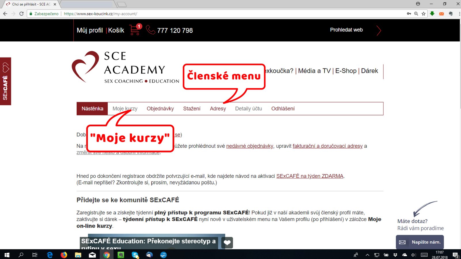 Po přihlášení se objeví vaše ČLENSKÉ MENU. V záložce MOJE KURZY najdete všechny kurzy, do kterých jste v tuto chvíli registrovaní, a to včetně programu SExCAFÉ.